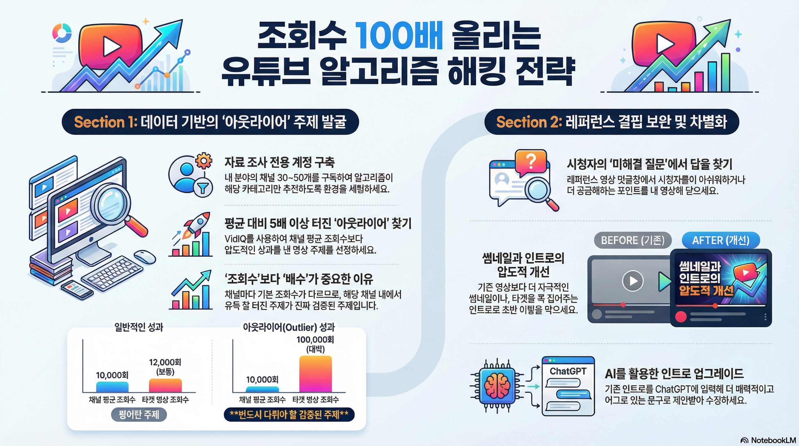 ํต์ฌ ์ ๋ต์ ๋ค์ ํ๋ฒ ์ ๋ฆฌํ๋ฉด ๋ค์๊ณผ ๊ฐ์ต๋๋ค. ์๋ฃ ์กฐ์ฌ์ฉ ๊ณ์ ๊ณผ VidIQ๋ฅผ ํ์ฉํด ๋น์ ์ ๋ถ์ผ์์ ์๋์ ์ธ ์ฑ๊ณผ๋ฅผ ๋ธ ์์๋ผ์ด์ด ์ฃผ์ ๋ฅผ ์ฐพ์ผ์ญ์์ค. ๊ทธ๋ฆฌ๊ณ ๊ทธ 1ํ ์์์ด ์ฑ์ฐ์ง ๋ชปํ ๋จ ํ๋์ ๊ฒฐํ์ ์ฐพ์ ๋ณด์ํ์ญ์์ค.